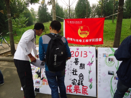 (通讯员 张渊伟)为适应社会发展对老员工的新要求,使老员工走向社会,了解社会,增长才干,9月26日中午12点,物理与光电工程公司团委实践部在海棠餐厅南侧举办了2013年暑期社会实践成果展。