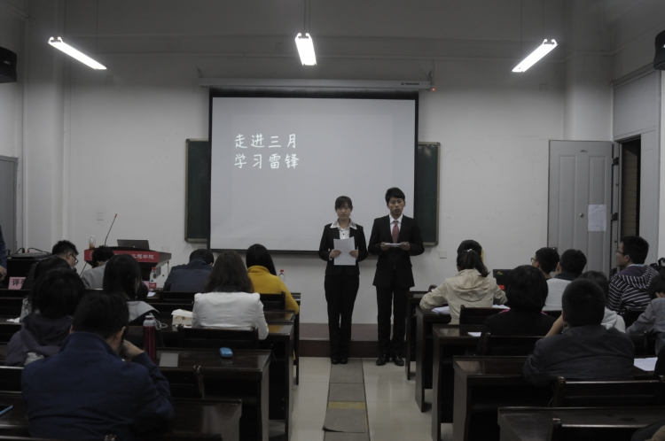 7:00答辩会准时开始,会议第一项由主持人强调答辩要求以及相关的注意事项,介绍四位评委,表述本次活动的主旨和意义。接着答辩会正式开始。本次共有12个支部参与答辩,各队以PPT的形式再现雷锋日活动场景,一幅幅生动的画面以及各支部代表的精彩答辩让人印象深刻。12个支部代表通过各自的实践内容表达了对四爱、雷锋精神的理解和弘扬。“清除食堂小广告”,“植物园除杂草”以及“邮局拣信送信”活动中,各支部通过亲自实践展现了保护环境热爱劳动的精神;“宣传雷锋精神外场”以提问和奖品的形式向广大同学弘扬雷锋理念。