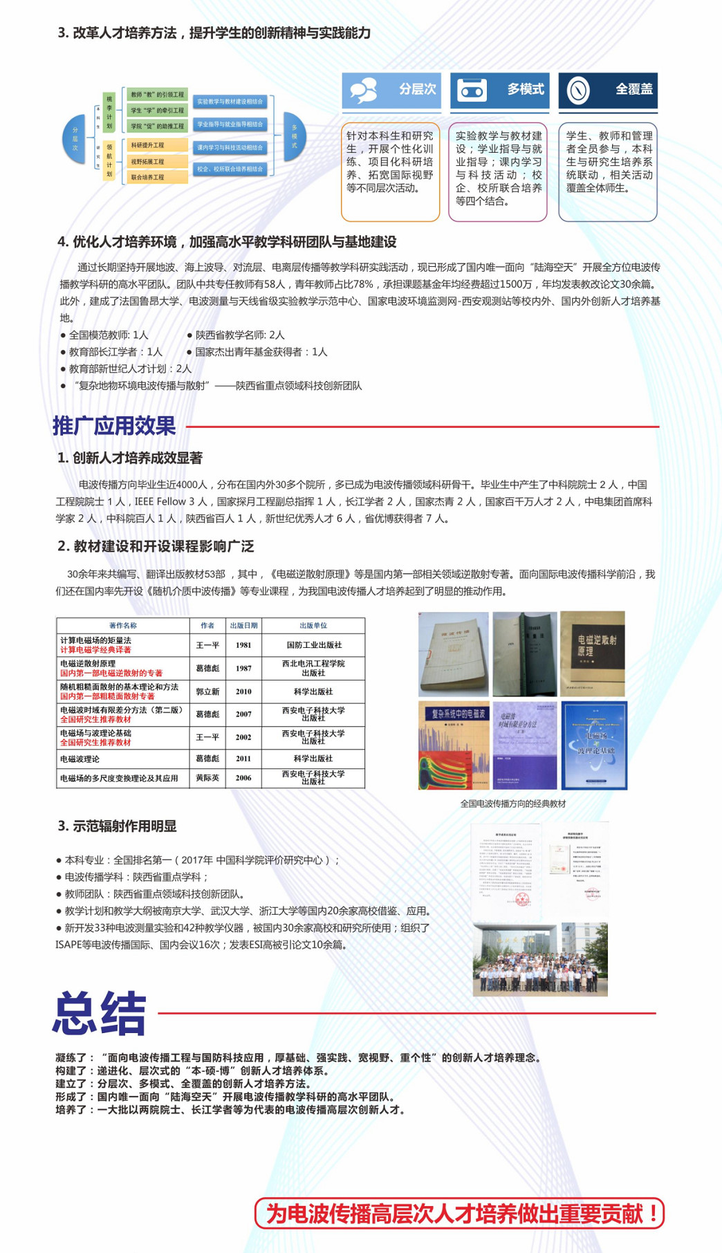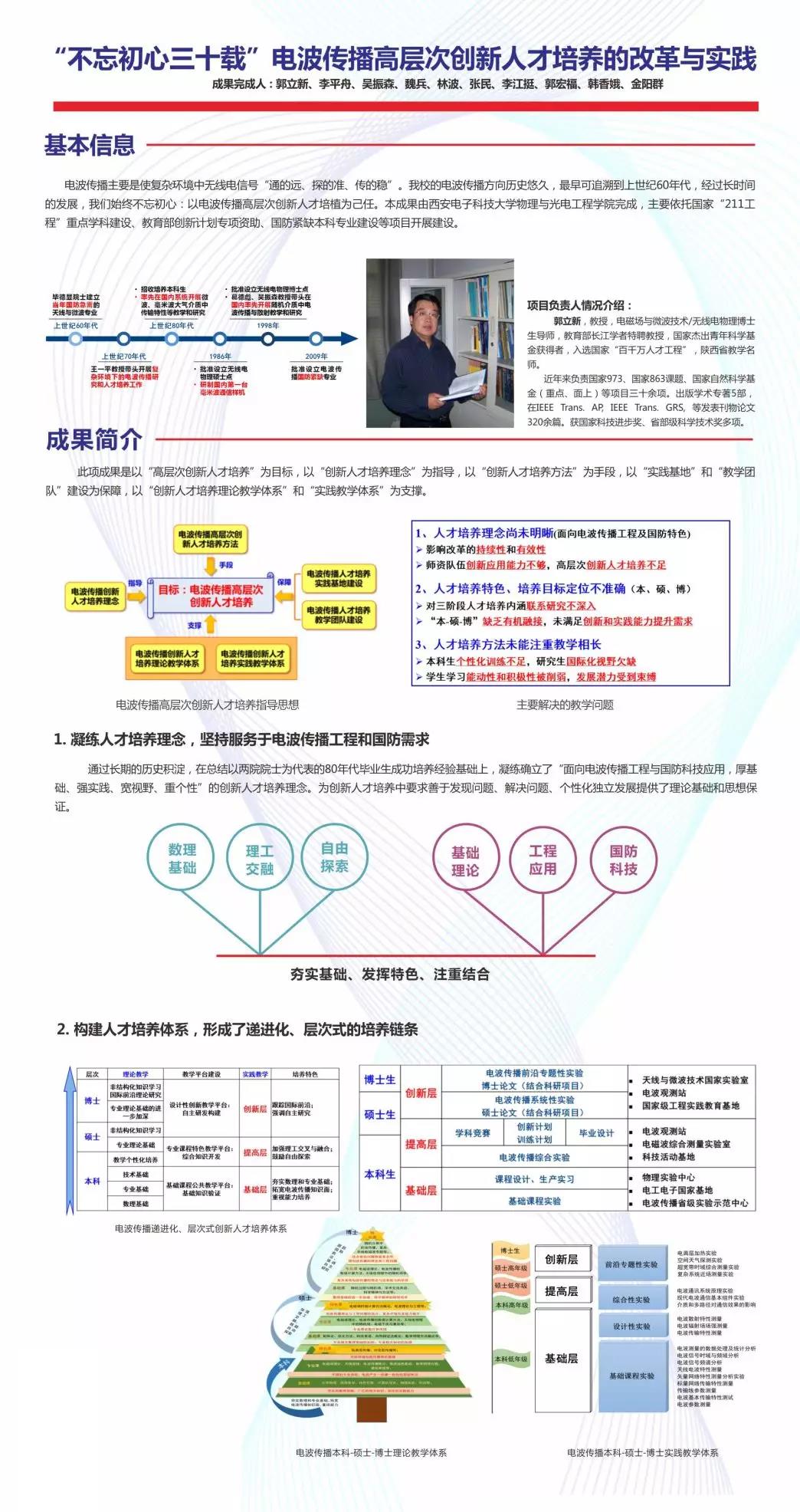 近日,教育部公布了2018年国家级教学成果奖(每四年一届)的获奖项目名单。其中由公司郭立新教授等人完成的《“不忘初心三十载”——电波传播高层次创新人才培养的改革与实践》成果荣获二等奖。国家级教学成果奖是由国务院所确定的国家级奖励,是与国家自然科学奖、国家技术发明奖、国家科技进步奖并列的国家级奖项,它代表着我国高等公司产品工作的最高水平。由公司(西电)作为第一完成单位推荐申报的5项成果全部获奖,包括一等奖1项、二等奖4项。