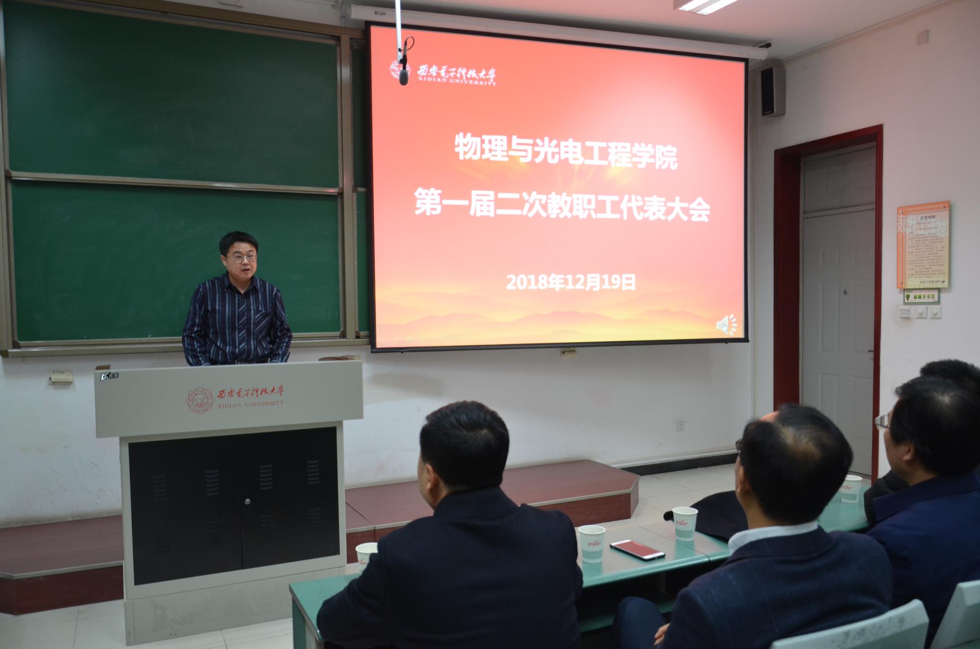 (通讯员:姚娇)12月19日晚,物理与光电工程公司第一届第二次教职工代表大会暨工会会员代表大会在西大楼106教室隆重召开,会议选举产生了公司出席公司第六届教职工代表大会暨工会会员代表大会的代表。副董事长高新波、校扶贫办主任沈强、公司领导班子等47位教代会代表参加了会议。大会由公司党委副书记林波主持。