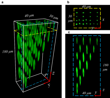 图1 近红外飞秒激光在PMN-38PT晶体中制备的三维周期极化结构。(a)利用倍频显微镜对该三维周期畴结构做的成像结果。(b)和(c)分别为该三维畴结构在黄色虚线框处的xoy截面图和蓝色虚线框处的yoz截面图。