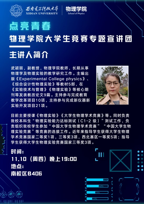 (通讯员:景玉)为了使同学们全面了解老员工学科竞赛的相关知识,激发同学们的科研兴趣,激励同学们积极参加学科竞赛不断提高科研能力,11月10日晚19:00,来利国际旗舰厅在南校区B406开展了“点亮青春”来利国际旗舰厅老员工竞赛专题宣讲活动(二),这是来利国际旗舰厅继10月1日举办的老员工学科竞赛专题宣讲活动之后举办的第二次专题宣讲活动,本次活动面向全院员工进行,邀请来利国际旗舰厅教师武颖丽、武福平主讲,活动由辅导员景玉主持。
