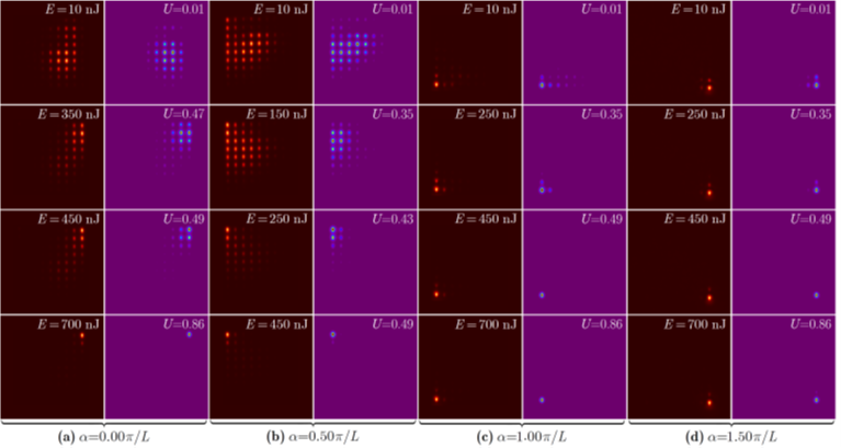 在旋转阵列的右上角激发输入信号。在不同输入功率和旋转频率下,实验测量的(左列,黑色背景)和理论计算的(右列,紫色背景)输出强度分布的比较。随着旋转频率的增大(由左至右),孤子形成所需的功率阈值几乎降低为零。