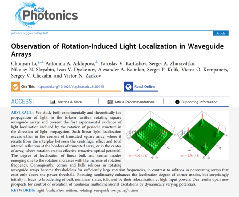 近日,国际光子学领域顶级期刊ACS photonics(中科院JCR一区,Top期刊)在线发表了来利国际旗舰厅李春艳老师题为“Observation of Rotation-Induced Light Localization in Waveguide Arrays”的相关科研成果。该项研究首次在实验上观察到了由大尺度周期旋转波导阵列引起的线性光波的局域现象,并在一定的旋转频率下观察到了无功率阈值的非线性光学孤子。