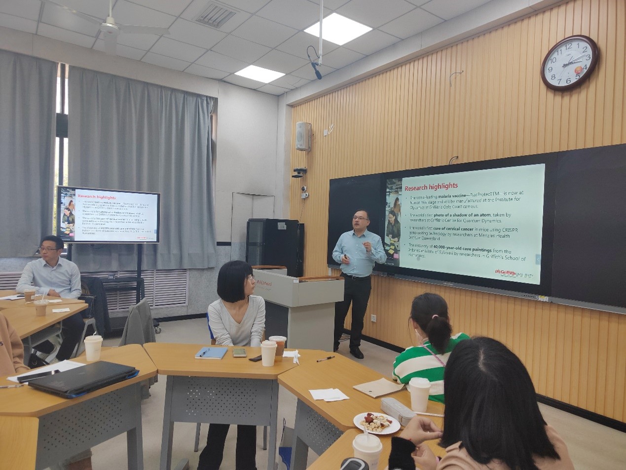 JunZhou教授从团队建设、办学特色、专业设置、课程体系、代表性成果、奖助学金等方面对格里菲斯大学进行了详细介绍,并重点介绍了格里菲斯大学的硕士和博士申请、联培的基本要求。期间,JunZhou教授还分享了自己的读书、求学的经历以及当地的就业环境、市场需求等,让同学们更加细致地了解到不同国家和地区在学习、生活方面的差异。JunZhou教授表示非常欢迎同学们申请格里菲斯大学的访学与联培项目。
