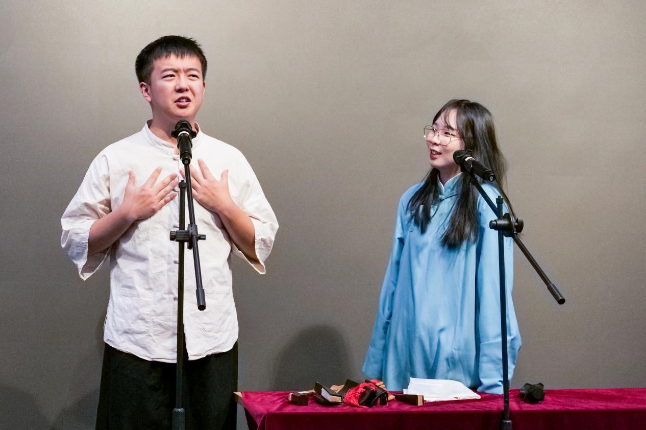 介四相声社的演员们表演了快板书《升国旗》,以及《买卖论》、《文章会》、《卖挂票》、《黄鹤楼》四段传统相声。几段相声节目均脱胎于传统文本,演员们对传统的演出内容进行了适当改编,加入了符合西电研究生生活的新鲜内容。现场演出效果火爆、氛围热烈,观众情绪在演员举手投足间达到顶峰,幽默滑稽的表演引得现场师生笑声不断。