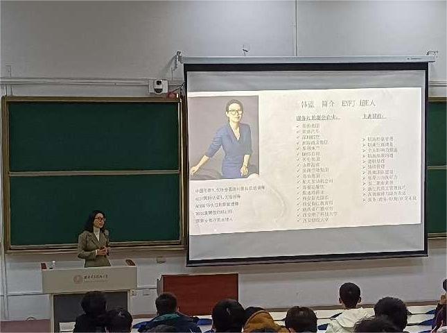 在下半程的分享中,韩蓝老师进一步阐述了生涯规划与个人发展的紧密关系。通过生动的实例和鲜活的数据,老师向同学们展示了不同职业路径的发展前景和所需技能,帮助大家更好地认识自我,明确自己的职业倾向。为了让同学们更加深入地了解自己的性格特点,老师还带领大家进行了性格测试。这项测试旨在帮助同学们更加准确地把握自己的个性特征,从而更好地选择适合自己的职业方向。测试结束后,老师先是说出了自己的性格特点,然后邀请同学们分享测试结果,对测试结果进行了个人解读,并针对不同员工的性格特点和优势,提出了个性化的生涯规划建议。
