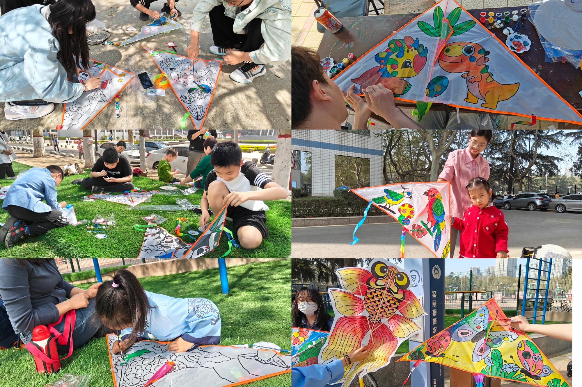 活动现场准备了风筝手工DIY材料,师生们纷纷动手,根据自己的喜好为风筝涂色,绘出五彩图案,尽情挥洒创意,金鱼、燕子、蝴蝶、老鹰……一架架栩栩如生的风筝画出了心愿,画出了春天的色彩。风筝DIY不仅吸引了在校师生,许多稚气未脱小朋友们也纷纷参与进来。他们与“大孩子”们一起,把呼之欲出的童趣和青春落在风筝上。手牵细细一线,与天空拔河,拉着云彩尽情奔跑,形色各异的风筝乘着春风在蓝天下放飞,装点了晴空,放飞了梦想。