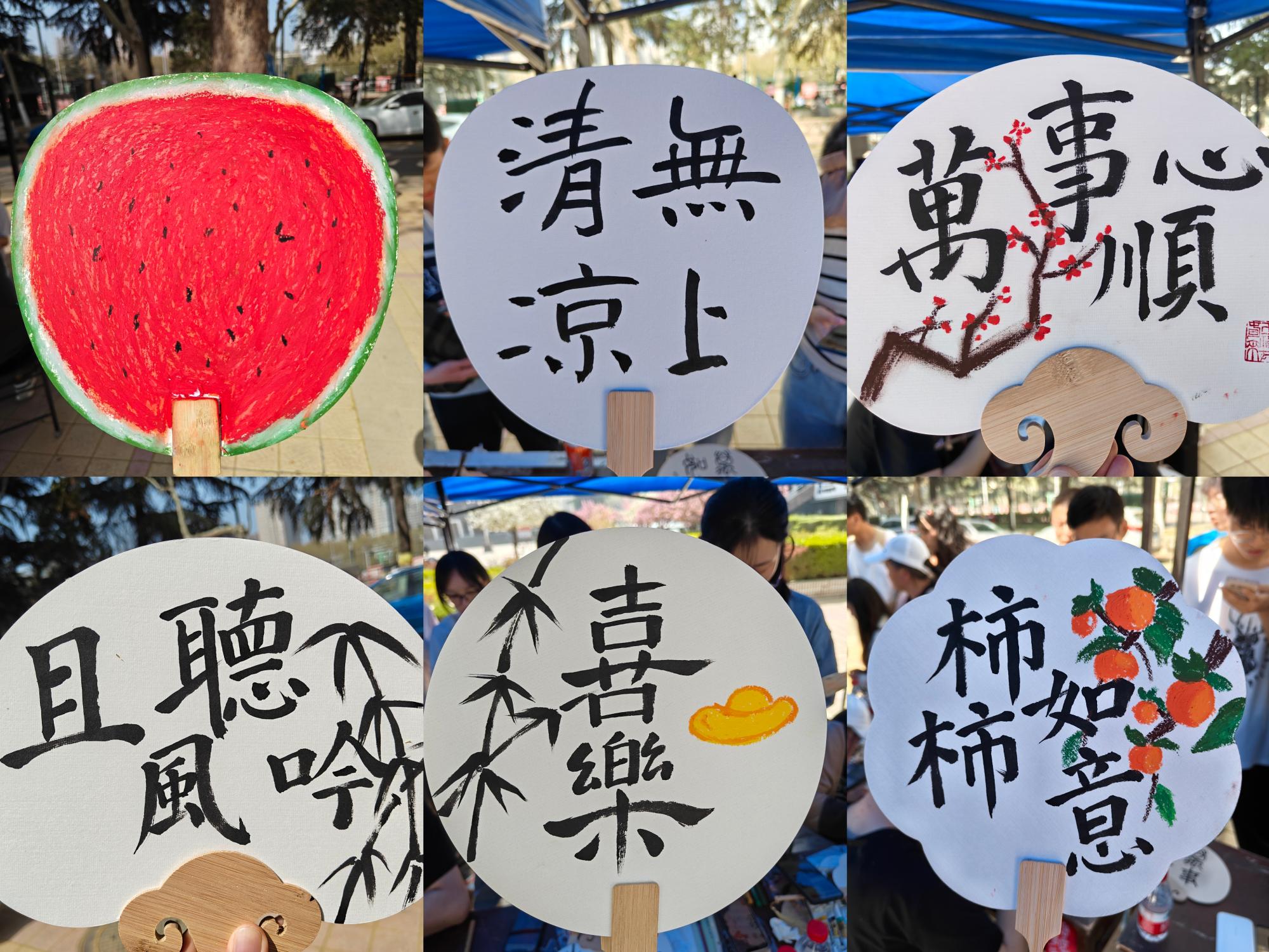 活动现场也准备了空白纸扇,在工作人员的指导下,同学们在扇子上进行书画创作,原本空白的团扇,变得花团锦簇,梅兰竹菊,四君子代表了纯洁的品质;高山流水,象征高尚的志趣。