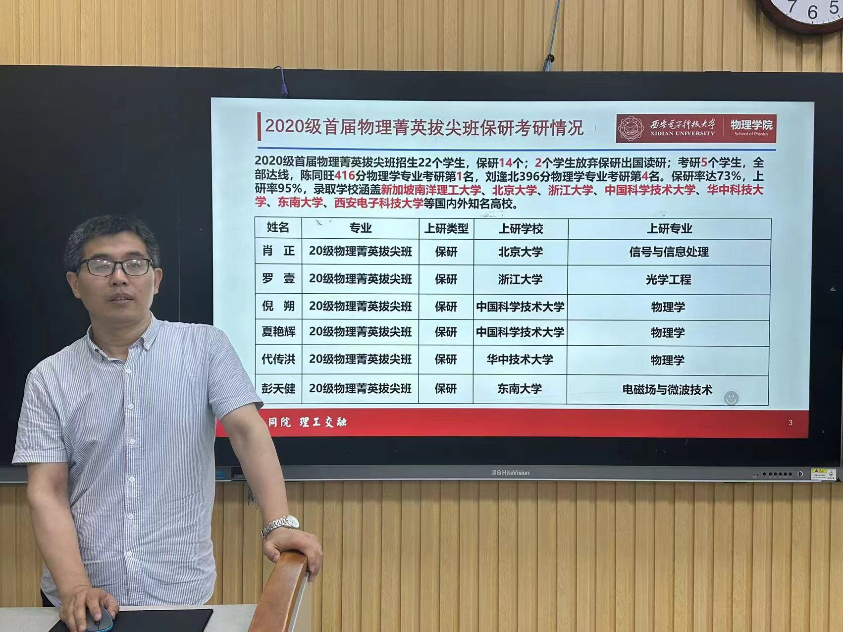 (通讯员 张钊)为进一步提升人才培养质量,帮助2021级物理菁英拔尖班的同学们了解保研信息、提升考研技巧,5月15号下午,来利国际旗舰厅邀请首届物理菁英拔尖班保研、考研及出国留学的优秀学子进行经验分享,会议在南校区C楼115教室举行,物理系副主任兼物理菁英拔尖班负责人崔志伟以及2021级物理菁英班全体员工参加了本次交流会,会议由辅导员景玉主持。