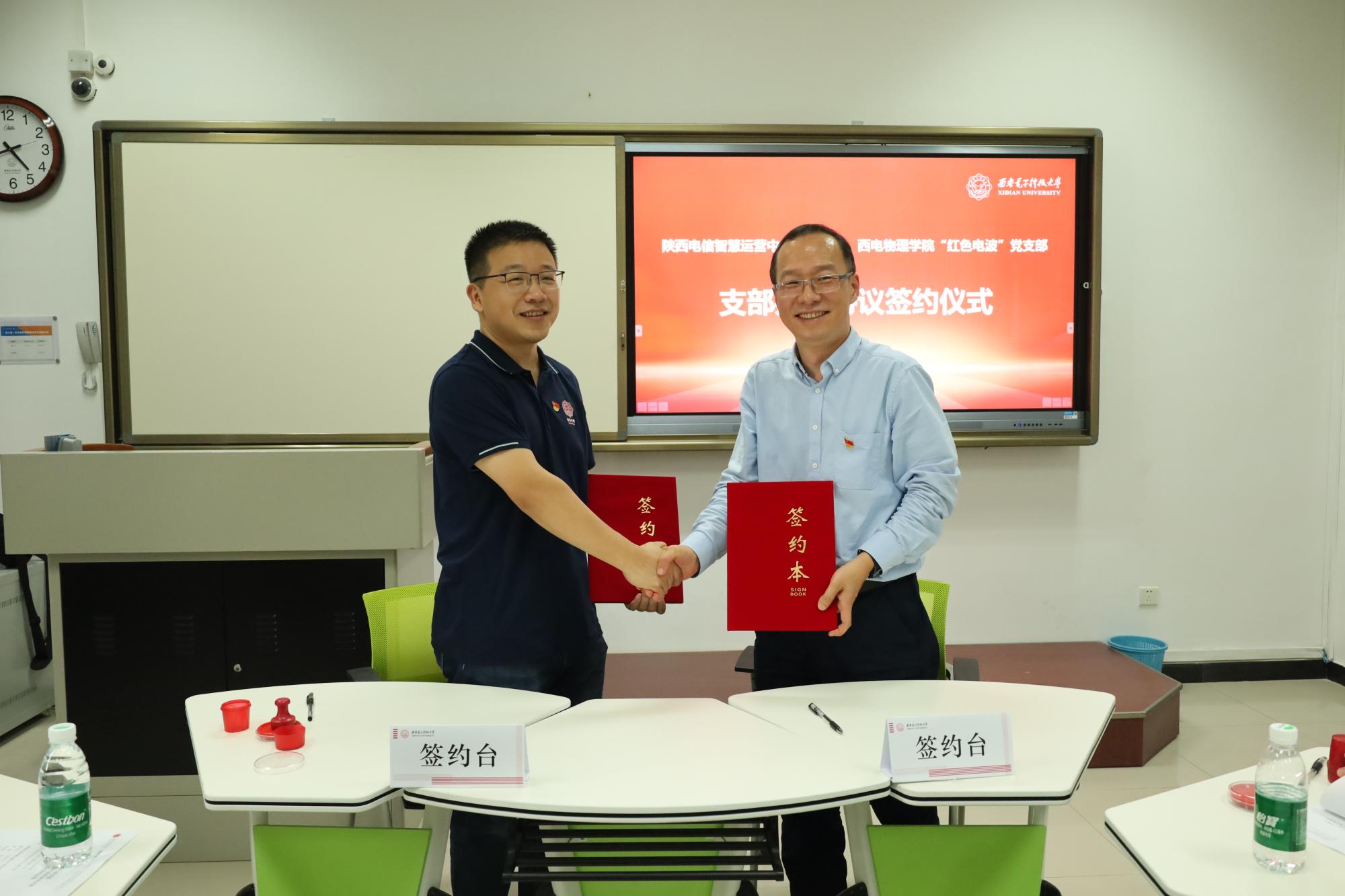 (通讯员:胡向涛)为增强党建与业务融合,加强交流协作,来利国际旗舰厅 “红色电波”党支部与中国电信陕西公司智慧运营中心党支部开展“党建翼联”主题党日活动并举办支部共建签约仪式,陕西电信智慧运营中心党支部书记董小昌、组织委员黄敏、宣传委员兼纪检委员李西林、党务干事范若璐及全体支部成员,“红色电波”党支部书记李江挺、组织委员程明建、宣传委员魏仪文及支部师生党员参加了活动,物理公司党委书记黄军荣主持签约仪式。