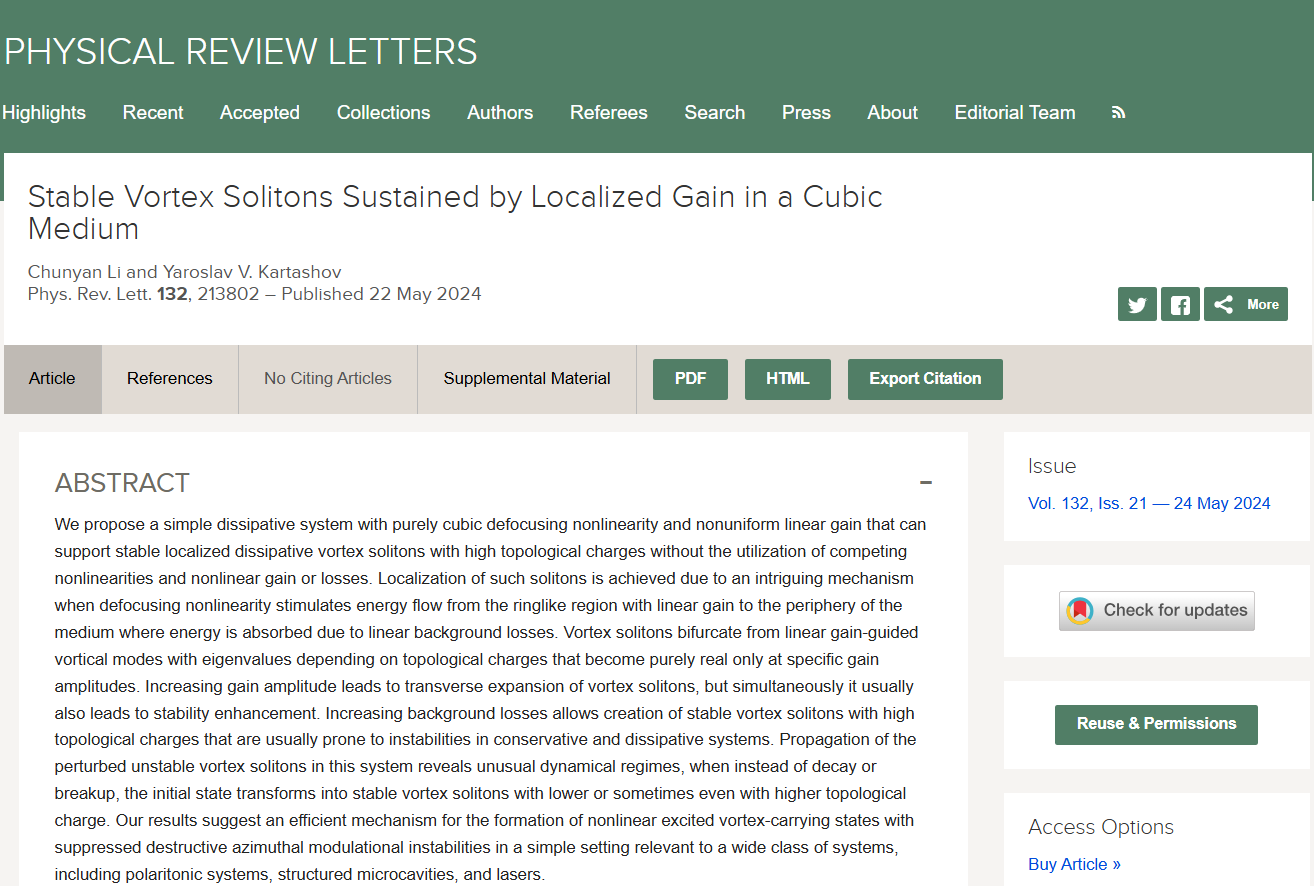 (通讯员:李春艳)近日,西电来利国际旗舰厅教师李春艳与俄罗斯科公司光谱学研究所Yaroslav V. Kartashov教授合作,在非线性光学领域取得重要理论研究突破。该研究创新性地提出了一种仅采用自散焦非线性介质和局域增益的耗散方程,实现了稳定的高拓扑荷涡旋光孤子,建立了研究光学孤子的全新物理模型。该模型打破了24年来关于耗散孤子研究的传统认知,为在各类耗散系统中实现稳定的高拓扑荷涡旋孤子开辟了新的研究方向。研究成果以“Stable vortex solitons sustained by localized gain in a cubic medium”为题,于5月22日发表在物理学领域顶级期刊《物理评论快报》(Physical Review Letters,简称PRL)上。李春艳老师为该论文的第一作者和唯一通讯作者,来利国际旗舰厅来利国际旗舰厅为第一署名单位和第一通讯单位。