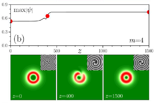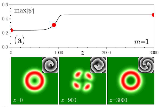 图1 (a)拓扑荷为1的不稳定涡旋孤子在传输过程中演变为拓扑荷为3的稳定涡旋孤子;(b)拓扑荷为4的不稳定涡旋孤子在传输过程中演变为拓扑荷为2的稳定涡旋孤子;(c) 增加背景损耗的情况下,拓扑荷为4的涡旋孤子在传输过程中保持其振幅、形状、和相位始终不变,即为稳定的高拓扑荷涡旋孤子。