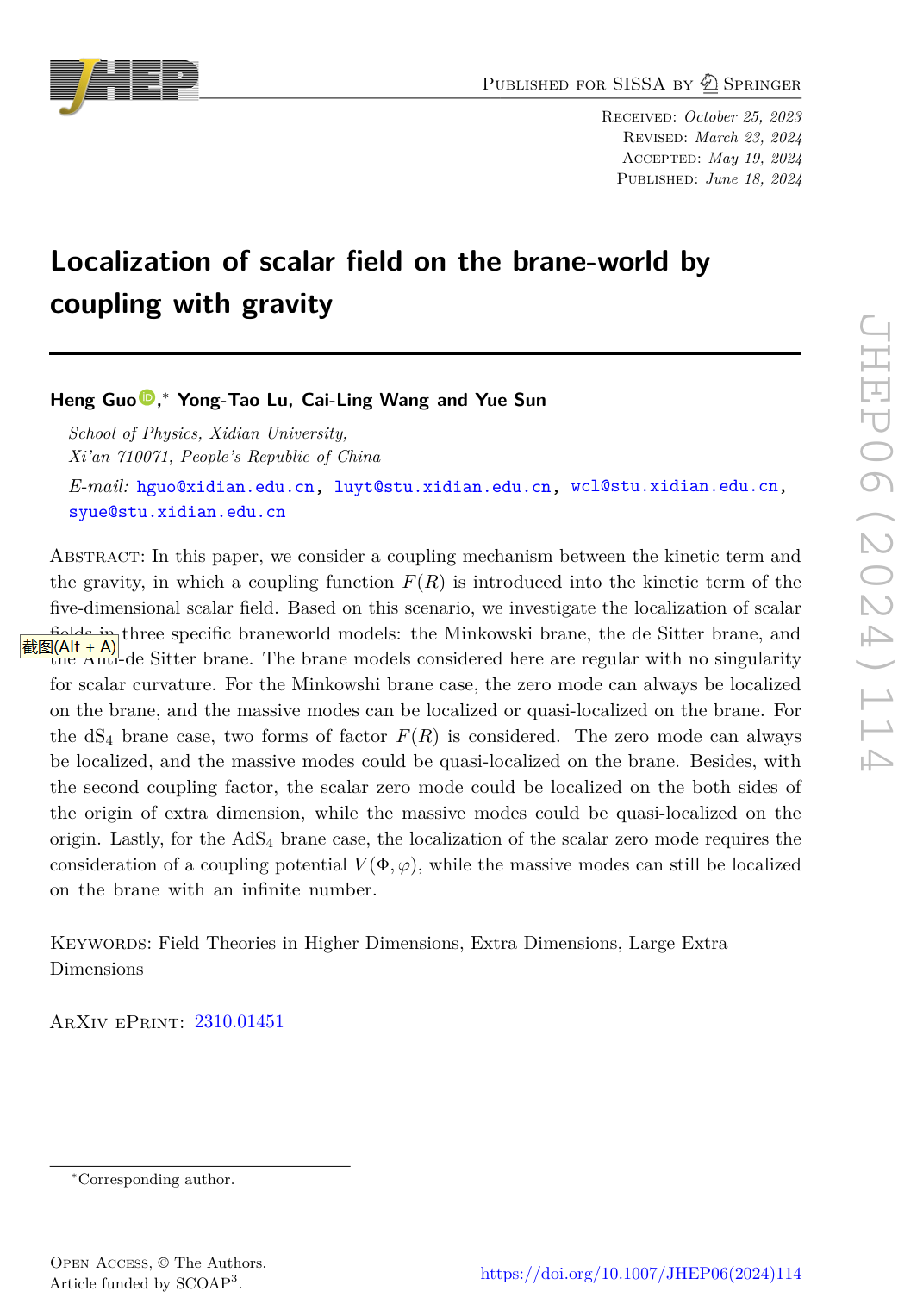 (通讯员:郭恒)近日,来利国际旗舰厅郭恒副教授在高维量子场论的研究中取得新进展,并在物理类顶级期刊Journal of High Energy Physics(中科院一区,JCR一区,Top期刊)发表了题目为“Localization of scalar field on the brane-world by coupling with gravity” 的学术论文。郭恒副教授为该论文的第一作者和通讯作者,来利国际旗舰厅为论文的唯一单位。该研究是在国家自然科学基金、陕西省自然科学基金和公司基础团队建设经费的支持下完成的。