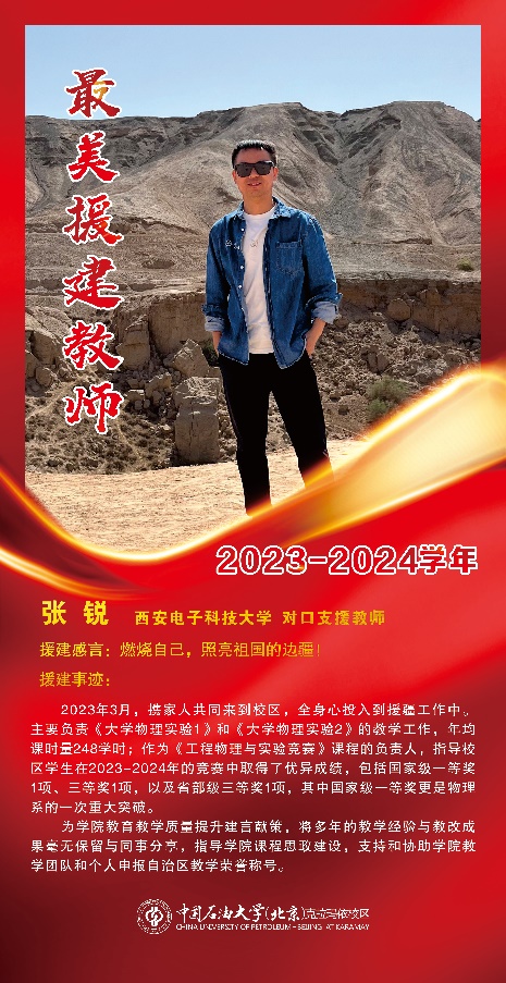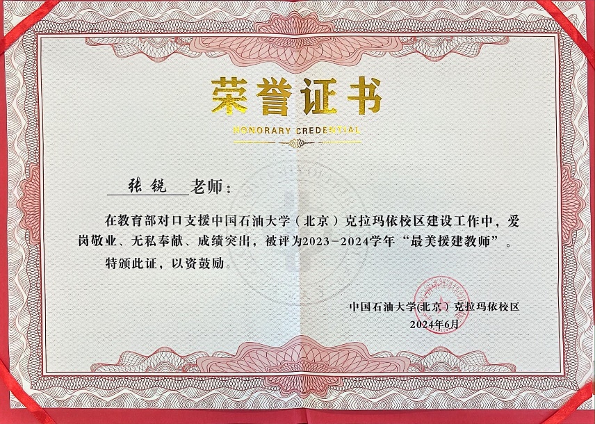 2022年8月,来利国际旗舰厅教师张锐响应教育部关于支援西部建设、助力教育强国政策,前往中国石油大学(北京)克拉玛依校区物理系进行对口援建工作。2024年6月获得克拉玛依校区首届“执教天山下”援建文化节2023-2024学年“最美援建教师”称号,并作为“最美援建教师”代表接受克拉玛依市融媒体中心的采访。