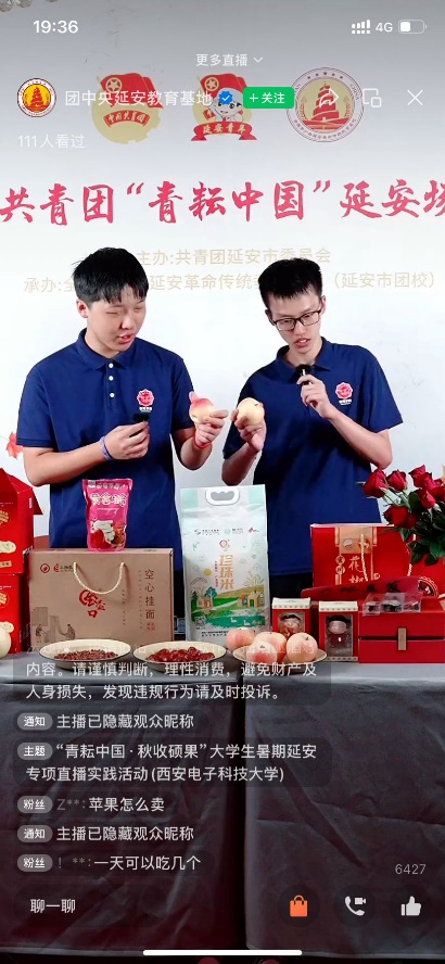 为贯彻国家乡村振兴战略,实践队员依托团中央延安教育基地直播平台,开展了“青耘中国 秋收硕果”专项直播活动。队员们通过线上网络平台,帮助当地农民直播售卖延安特色农产品,如红枣、苹果、小米等。直播过程中,队员们详细介绍产品特点,助力农民增收。此次直播活动吸引了众多网友关注,为延安特色农产品打开了销路,贡献了队员们的一份青春力量。