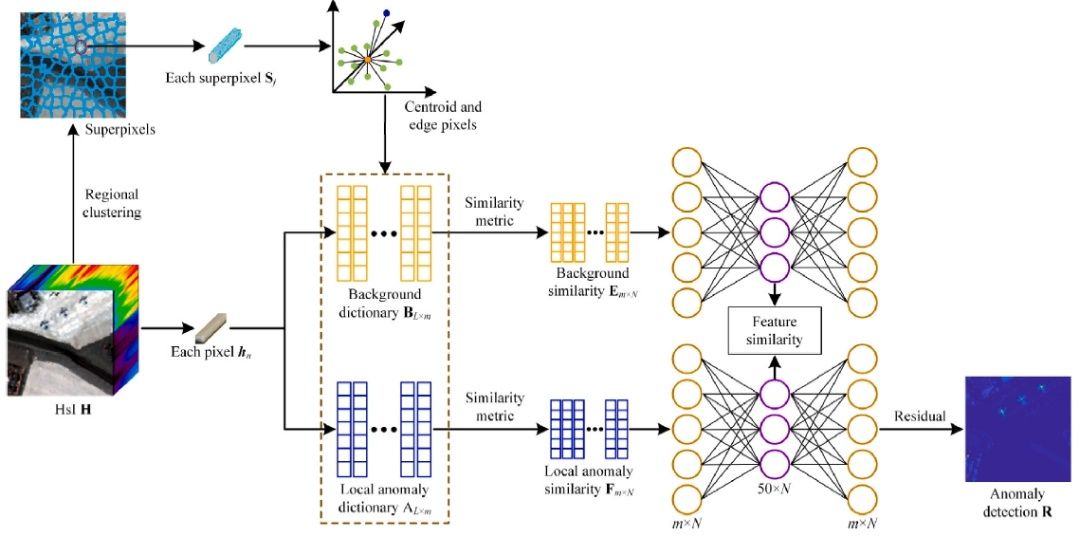 第一篇论文研究主要针对现有高光谱异常检测方法没有充分考虑像素之间的相似性,导致其背景重建精度低而影响检测性能的问题,创新提出了一种新颖的基于像素关联自编码器的高光谱异常检测方法。首先基于超像素距离估计引入字典构建方法,为背景和局部异常构建不同的字典。再将每个像素从原始HSI到背景字典和局部异常字典的相似性度量作为AE网络输入来实现像素相似性的识别,并提出建立了一种双隐藏层特征相似性约束网络来提高背景和异常目标的重建误差,以此建立评分,从而实现了优越的异常检测性能。