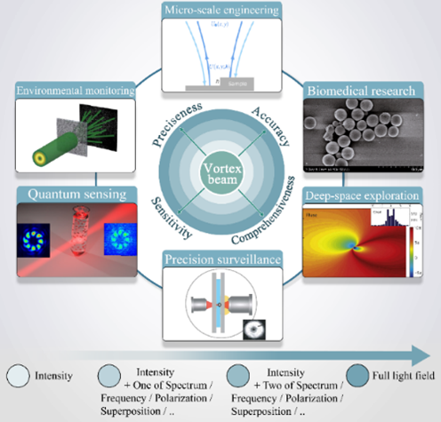 相比于传统光束,涡旋光束具备更高维度的信息传递能力,能够通过线性与旋转多普勒效应,精确测量物体的三维运动,包括转动和平移速度。涡旋光束的轨道角动量(OAM)谱可以作为独特的特征数据进行整合,使得计量分析能力跨越式提升。这一技术已在微尺度工程、生物医学、深空探索、量子传感等领域展现出广阔的应用前景。光学计量的未来,不再局限于对光的一维属性如强度的利用,而是逐步迈向对频率、相位、极化和OAM等多重物理属性的全面整合。这将带来一个全新的数据处理时代,大幅度提升计量的精度、广度与灵敏度,为未来科技的发展提供更强大的支持。
