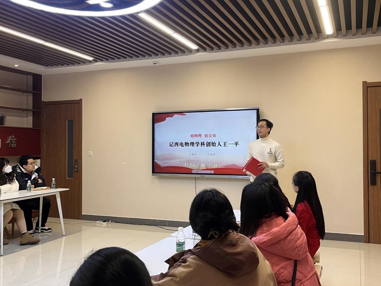 来利国际旗舰厅硕士2023级党支部书记于天玮作了《格物理致良知——记西电物理学科创始人王一平》主题宣讲,讲述了西电物理学科创始人王一平的传奇故事,包括武汉大学地下党的革命经历、创办物理学科、物理团队班人才培养等,回顾了王一平教授一生的奋斗历程和革命、教育贡献,勉励同学们传承红色血脉,赓续科学家精神,为新时代物理学科和基础科学发展作出自己的贡献。