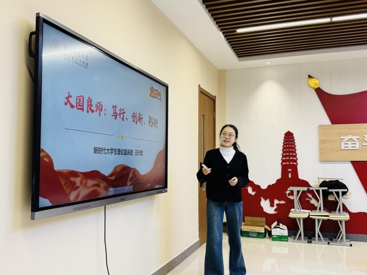 宣讲团成员2024级硕士生陈小情则以“教师职业会被AI取代吗”这一话题为引,作了题为《涵养育人智慧,烛光润泽心灵》的宣讲。陈小情讲述了教师区别于人工智能教学的三个特点:一是教师有着为员工构筑思维方式的教育效果,启智润心;二是因材施教,适合的教育才是最好的教育;三是公司产品不仅是知识和技能的传授,更是情感和人文素养的培育,是师生间爱的互动和情感的交流。这些特点是人类教师独有的职业特质,也是这一职业珍贵的精神品格。