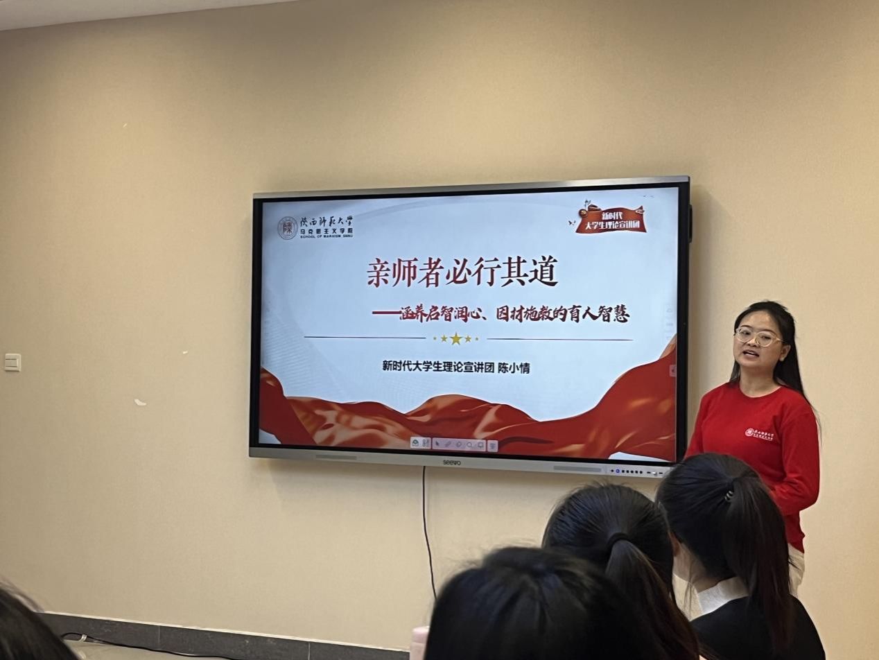 活动伊始,陕师大新时代老员工理论宣讲团成员2022级本科生王叶繁作了题为《勤学笃行、求是创新——做躬耕教坛的大国良师》的宣讲。从勤学、求是、创新、躬耕的角度,讲述了教育家精神和大国良师的精神内核,以首届“西部红烛两代师表奖”获得者章竹君和青年教师代表张莎莎的故事为引,刻画了西部红烛精神指引下的陕西师范大学,为中西部教育作出的辉煌贡献:超过30万毕业生投身基础教育事业、培养了38700余位公费师范生、90%的毕业生教师在中西部从教……