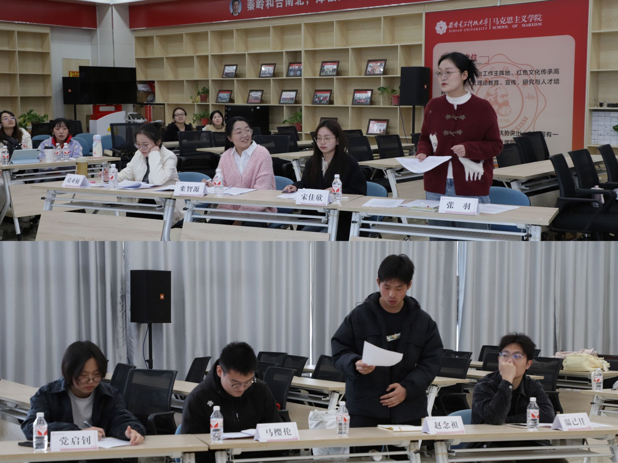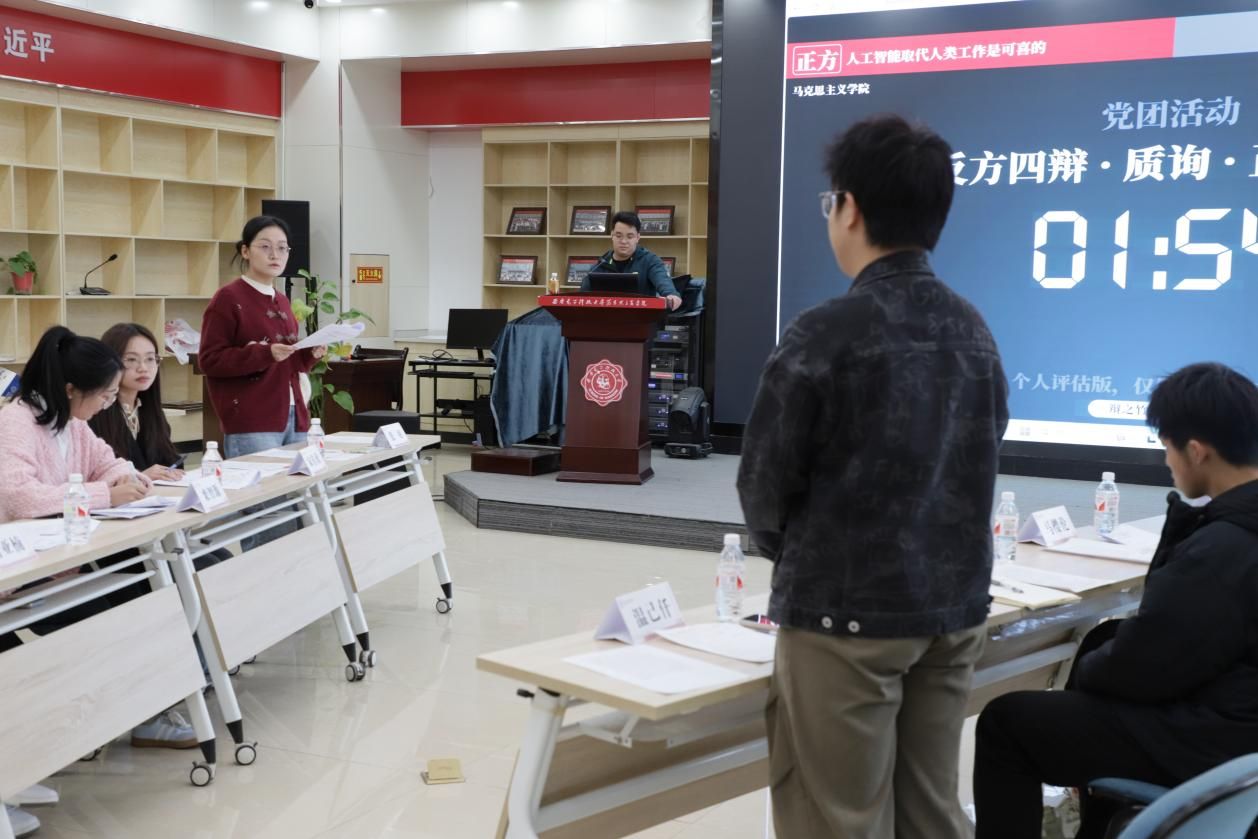 紧接着到来本次活动的高潮阶段:辩论赛。本场辩论赛的主题是“人工智能取代人类工作是可喜/可悲”,正方由马克思主义公司硕士第三党支部代表队组成;反方则由物理学院本科2023级党支部代表队担当。辩论赛在紧张而热烈的氛围中拉开帷幕。正方提出人工智能在核辐射清理、深海勘探等高危领域以及数据标注、流水线作业等重复性工作中的革命性意义。反方则指出,当人工智能普及率每提升10%,基础服务业将面临23%的岗位替代率,由此引发的结构性失业可能加剧贫富分化。其展示的硅谷清洁工被清洁机器人取代的真实案例,引发全场关于"技术红利分配正义"的深刻思考。