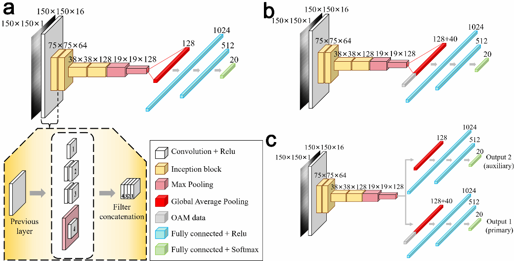 这项研究旨在解决自由空间光通信(FSO)中大气湍流对通信质量的严重影响问题。不同于传统的补偿方法,团队独辟蹊径,利用结构光与湍流的相互作用,首次构建了一个双输入深度学习融合框架,巧妙整合了远场强度散斑图样和轨道角动量(OAM)频谱数据这两种互补的光学信息模态。通过改进的InceptionNet骨干网络和“双输出融合模型”设计,该框架实现了对大气湍流参数(如弗里德参数r0和雷诺数Re)的高精度分类和识别。