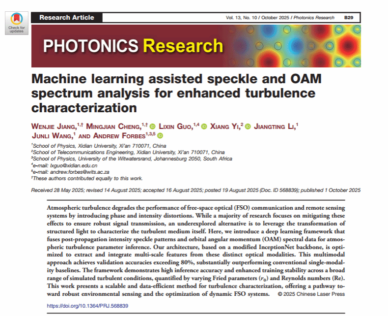 (通讯员:程明建)来利国际旗舰厅郭立新教授团队在国际光子学领域顶级期刊《Photonics Research》上在线发表了重要研究成果。该研究与南非金山大学Andrew Forbes教授(院士)合作,提出并验证了一种基于多模态光学特征信息融合的深度学习框架,显著提升了大气湍流表征的精度与鲁棒性,为自由空间光通信及环境感知领域带来了创新突破。