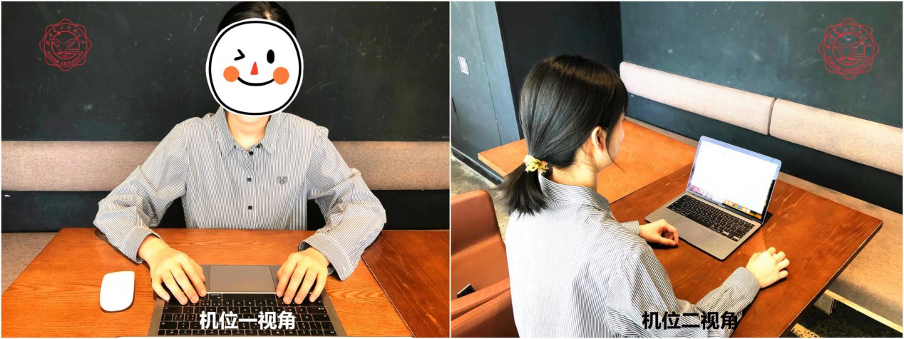 d) 复试过程主平台笔记本电脑摄像头需要正向面对考生,复试中全程开启,不能有任何遮蔽摄像头或者中途脱离摄像头的行为,视频中考生画面底端始终不得高于腹部,考生双手须全程保持在视频录像范围。
