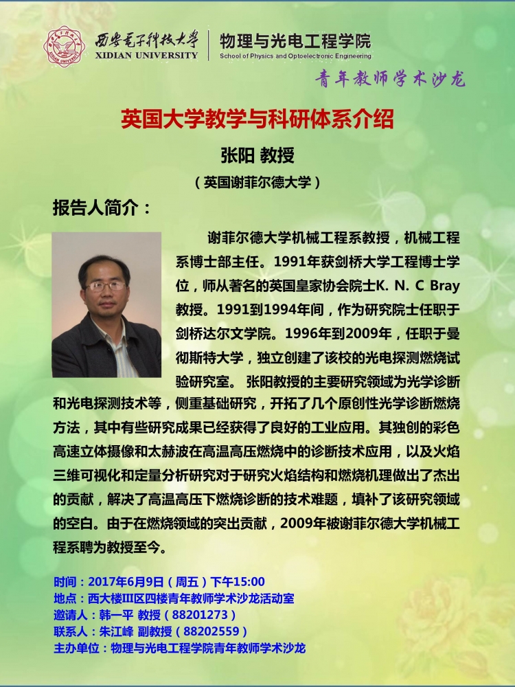 为进一步加强教学建设,创新人才培养模式,青年教师学术沙龙特邀请英国谢菲尔德大学张阳教授做题为“英国大学教学与科研体系介绍”报告,欢迎广大教师前来参加!