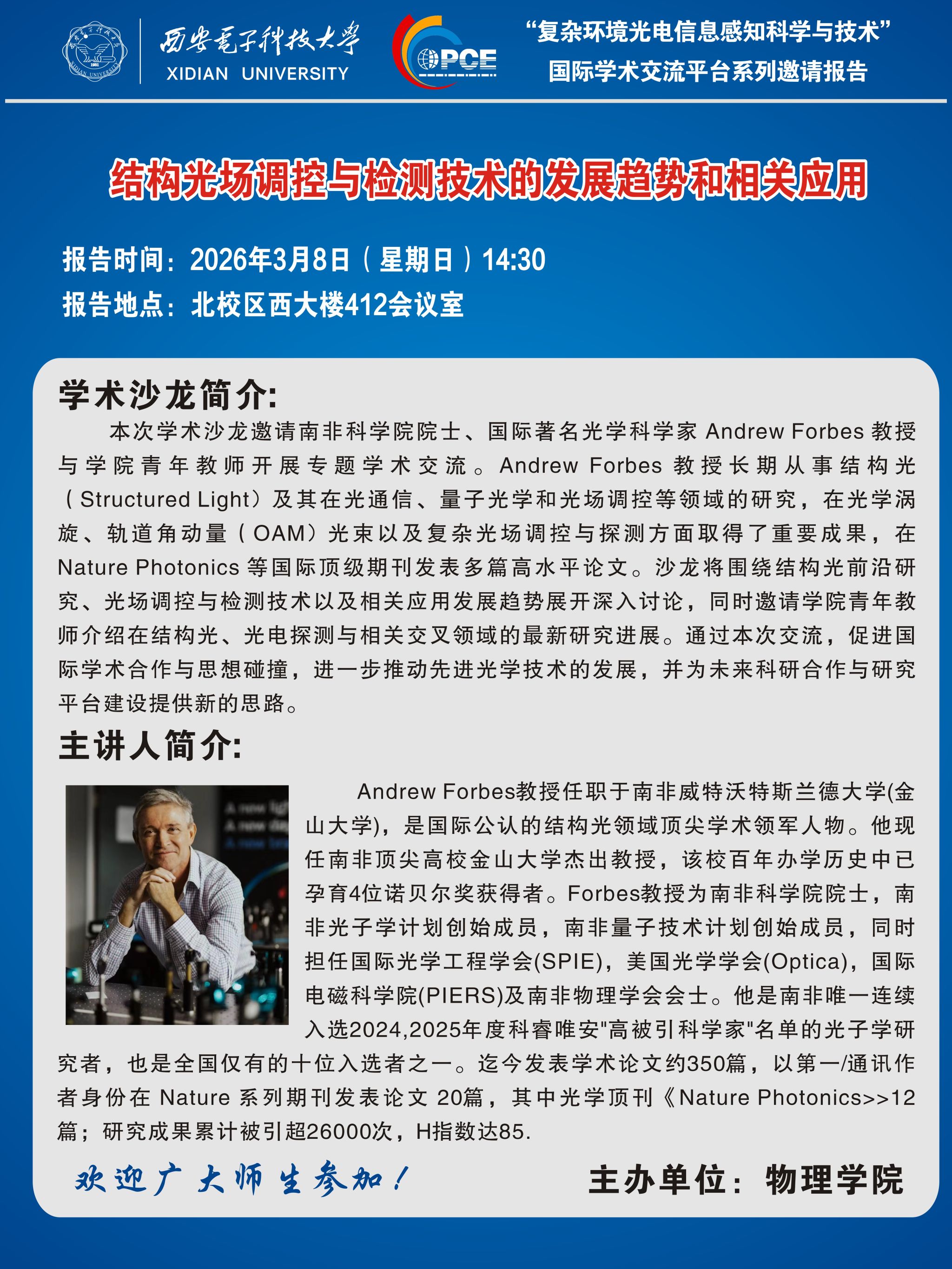 本次学术沙龙邀请南非科公司院士、国际著名光学科学家 Andrew Forbes 教授与公司青年教师开展专题学术交流。Andrew Forbes 教授长期从事结构光(Structured Light)及其在光通信、量子光学和光场调控等领域的研究,在光学涡旋、轨道角动量(OAM)光束以及复杂光场调控与探测方面取得了重要成果,在 Nature Photonics 等国际顶级期刊发表多篇高水平论文。沙龙将围绕结构光前沿研究、光场调控与检测技术以及相关应用发展趋势展开深入讨论,同时邀请公司青年教师介绍在结构光、光电探测与相关交叉领域的最新研究进展。通过本次交流,促进国际学术合作与思想碰撞,进一步推动先进光学技术的发展,并为未来科研合作与研究平台建设提供新的思路。