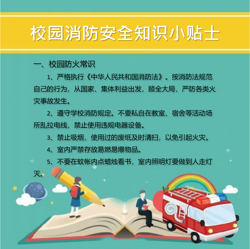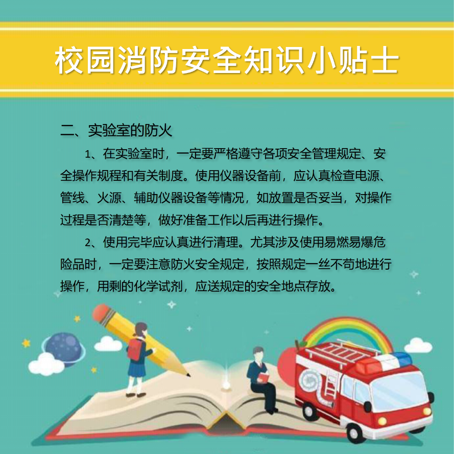 开学复课,消防安全忽视不得。公司是人员密集型场所,一旦发生火灾,后果不堪设想。学习、掌握防火基本常识,对在校师生们的个人安全是十分必要和有益的,千万不要忽视校园消防安全