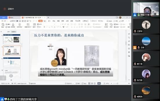 12月29日19点,物理与光电工程公司文明素养大讨论系列活动第二场在线上顺利开启。特邀心理健康教育中心丁兰艳老师为本科生讲授心理健康公开课,吸引了本科生和员工家长在线参与。活动由20级辅导员王纲主持。首先,丁兰艳老师从专业的角度解读了压力,详细介绍了压力产生之后常见的身体和心理发出的信号,有助于我们正确、快速的识别和判断。随后,针对近期疫情不确定性带来的考前压力,丁老师着重从面对压力、接受压力、处理压...